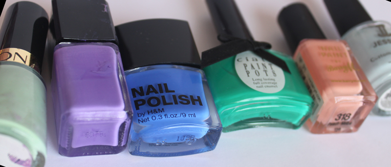 Revlon Minted (might be limitedd edition), Illamasqua Jo’Mina, H&M Blue My Mind, Ciate Ditch the Heels, Barry M Peach Melba and Jessica Bikini Blue