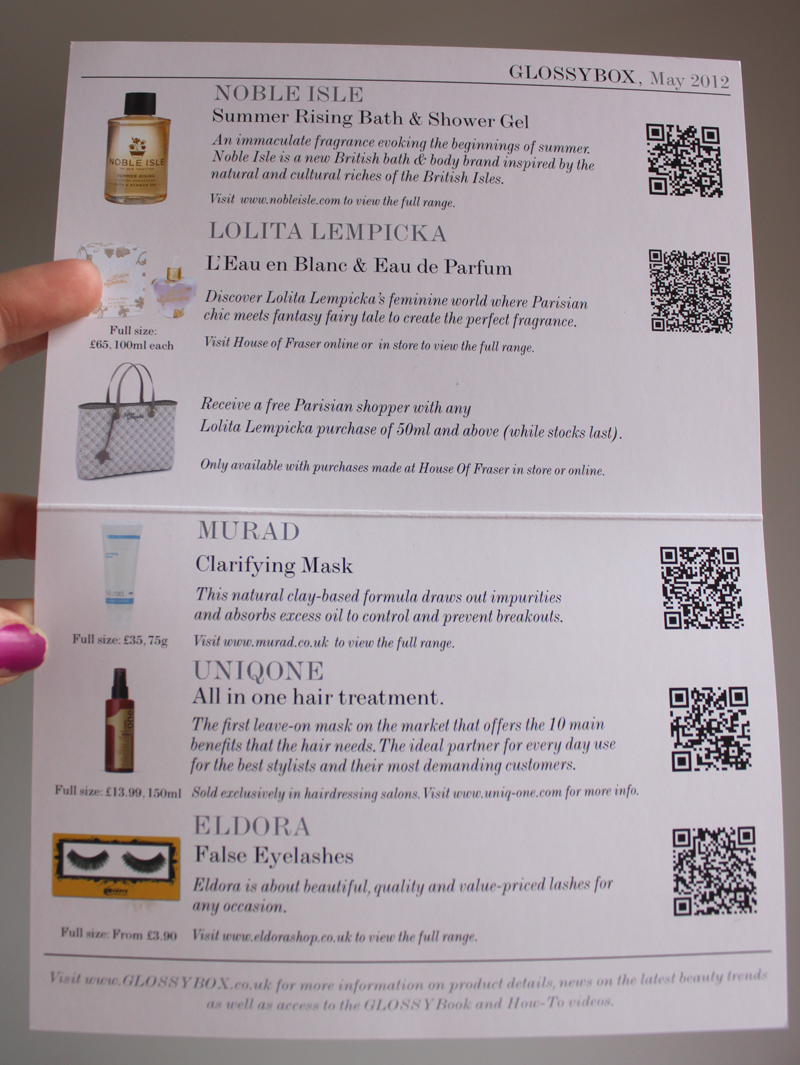 Other then that I quite like everything, the UNIQONE all in one hair treatment is a generous size and one I will probably get through, the Noble Isle Summer Rising is also something I can get use out of although I probably wouldn’t have purchased it myself. My two stand out product are the Murad Clarifying Mask which although targeted at acne I will still be using and (surprise surprise!) I like the perfume samples. Maybe there is actually a reason they include them in these boxes! Usually I moan about small perfume sample but I love the Lolita Lempicka L’Eau en Blanc and am seriously considering making it my summer scent.