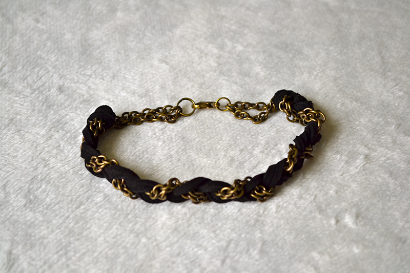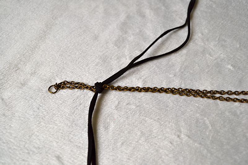 2. Measure and cut two 36 inch strands of suede cord. Make sure your have your chain flat against a surface and pass the two strands under the chain. Fold the suede strands in half and make sure they’re equal on both sides of the chain. Knot the two strands an inch down the chain. I don’t knot the suede cord just below the closure in case I need to make some adjustments to the length of the chain once the bracelet is finished.