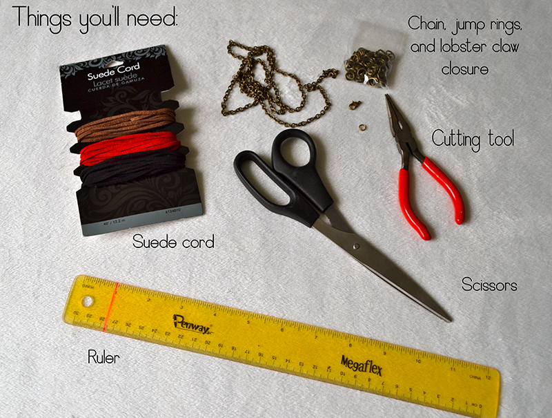 1. Measure and cut two 12 inch strands of chain. Join the two strands by attaching the jump rings. Attach the lobster claw closure on one of the ends.
