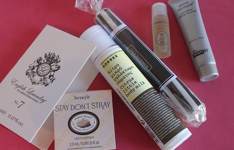Inside the box itself are some really great brands that I love and trust! The first thing that caught my eye was the Benefit Stay Don’t stay eye primer, which is a great little sample and I believe a new product. I also am very excited to use the Korres Body Milk which smells amazing as does the No7 perfume which although is small I really like the packaging of. There is also a generous size of Dr. Brandt Porerefiner which is quite an expensive product but I had never tried before. Lastly the Aroma Works Nurture Body oil which adds the perfect final touch of luxury to the box. As an added lifestyle extra there is also a Lulu Guinness Candy Rock for all you sweets lovers!