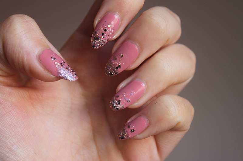 Today I went for Ballerina which is a really lovely pale pink and right on the tips I used Duchess. Duchess is part of their Texture Nail Glitters, as the name suggests they are quite gritty but I think it really works for this look as it is very dense. Over the top I applied the Rose Quartz Glitter which is a much chunkier and more sparse to give it a gradient look. I’m sure I’ll be reaching for some other Barry M glitter shades to create a similar look but it other colours.